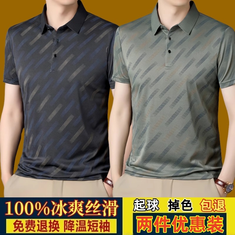 夏アイスシルクストレッチハイエンドシームレスメンズポロシャツスーツ薄手半袖ラペル中年Tシャツビジネス休暇