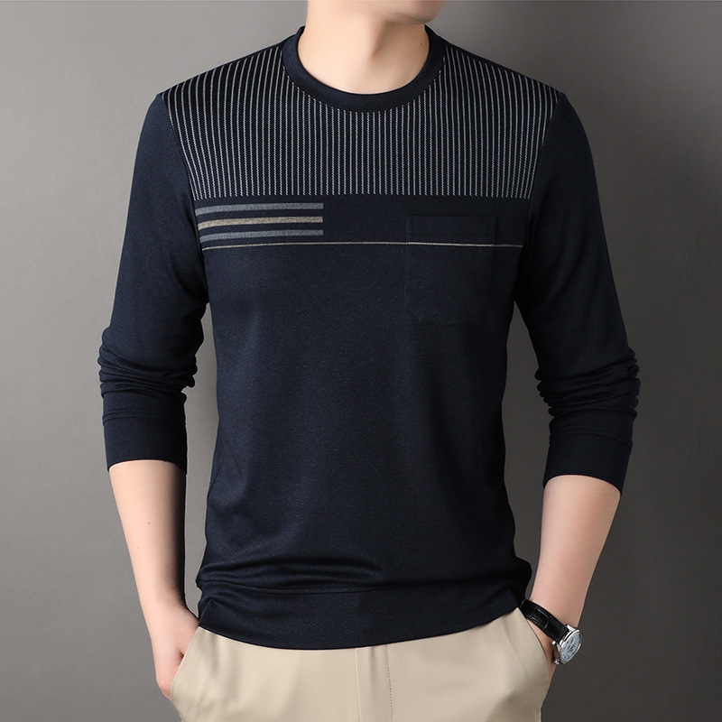 お父さんは本当にポケットの春と秋の長袖の中で年配の男性のカジュアルな丸首のタイプの底のシャツのストライプのtシャツの上着を詰めます。