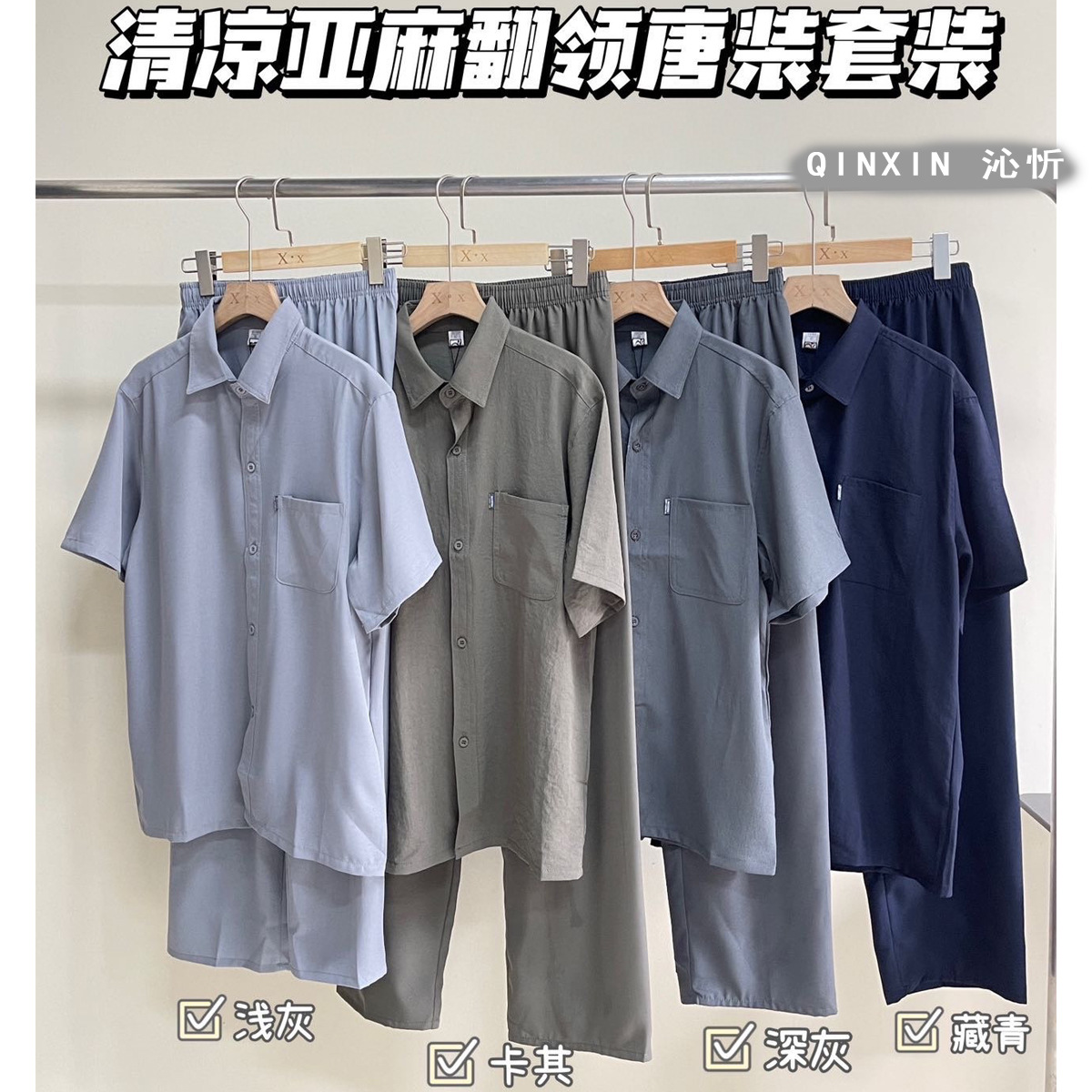 涼しいリネンラペル唐スーツお父さんサマースーツ中高年ルーズおじいちゃんアイスシルクカジュアルシャツ2点セット