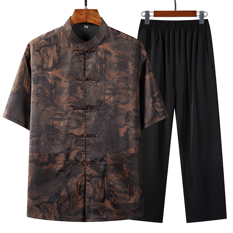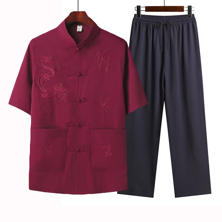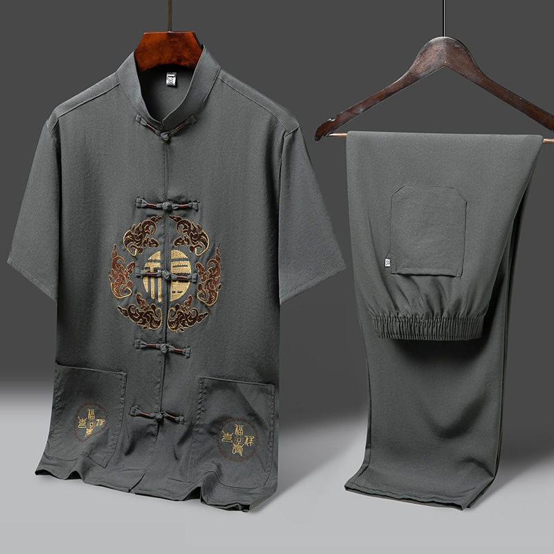 唐装メンズ中高年夏半袖スーツ中国風刺繍アイスシルクレトロお父さんカジュアルおじいちゃん着用漢服