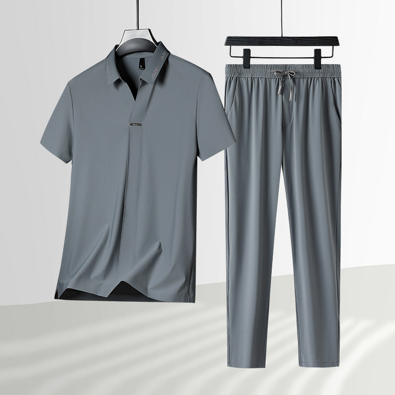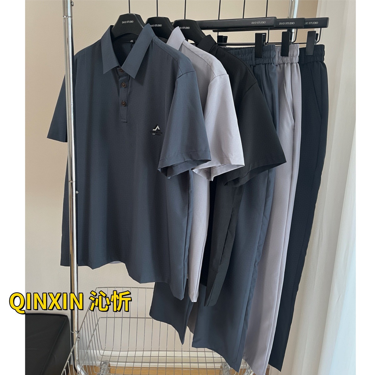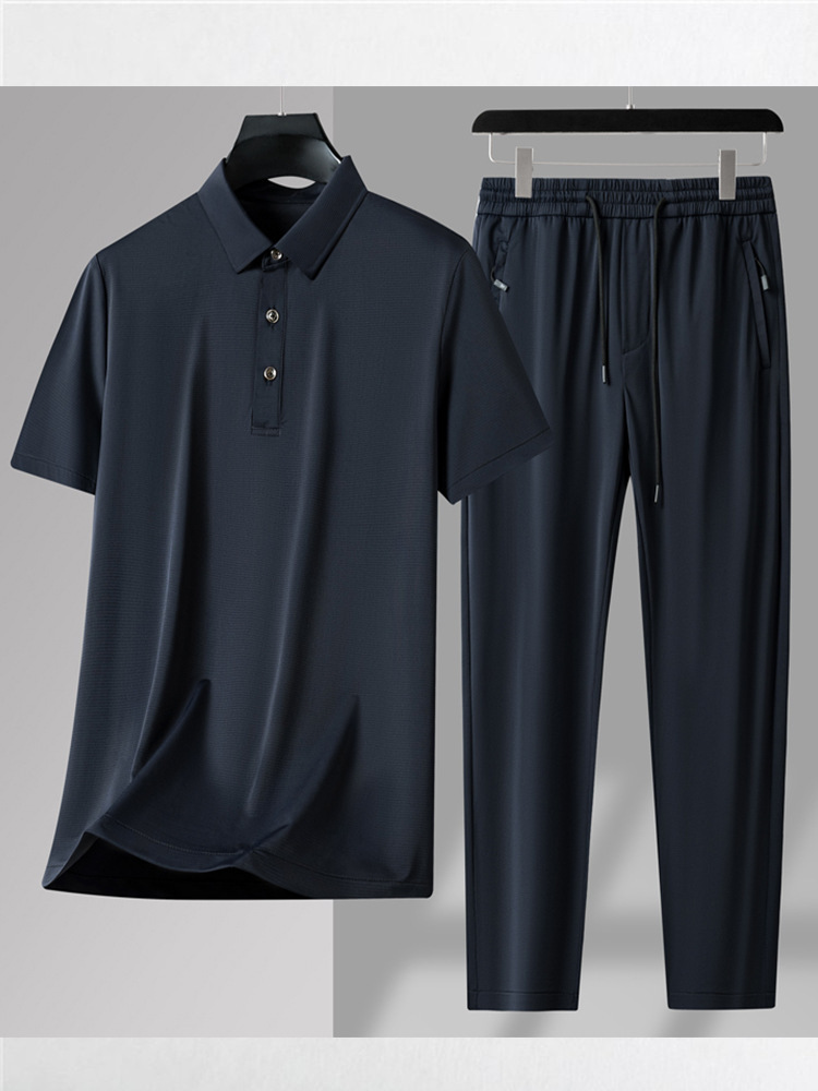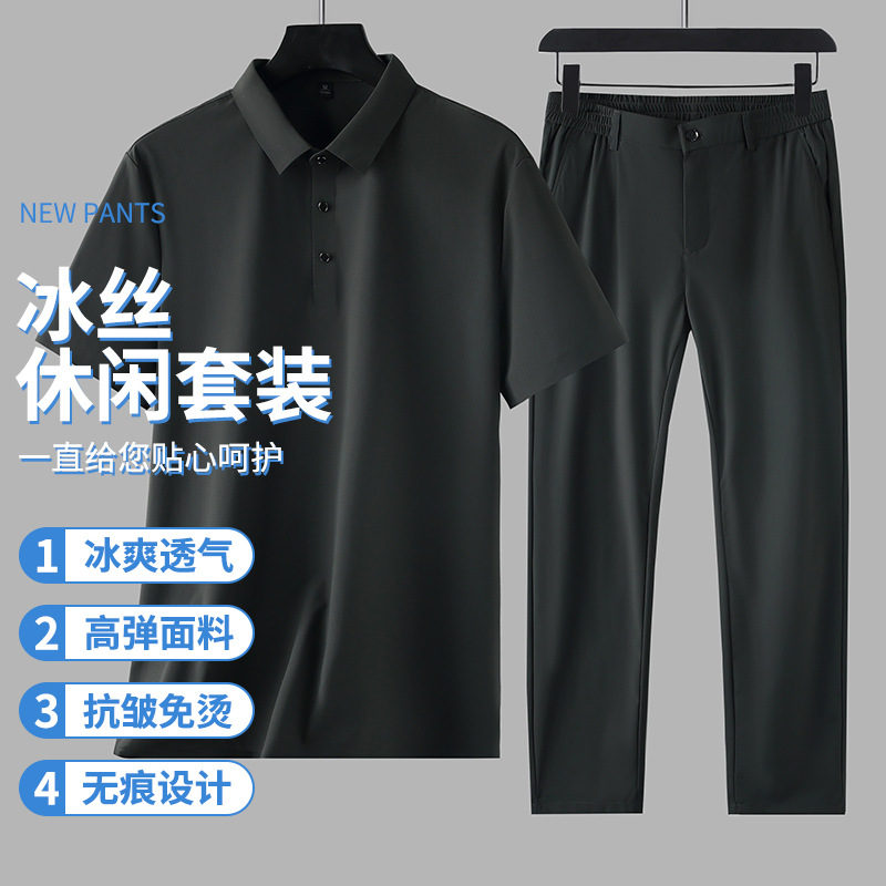 新しい夏のアイスシルク薄い弾性ポロシャツスーツ速乾性ストレートスポーツ紳士服中高年ツーピーススーツ