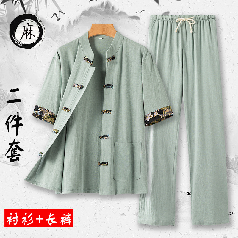夏中国風綿麻スーツ中高年男性お父さん半袖Tシャツおじいちゃんアジア服2点セット