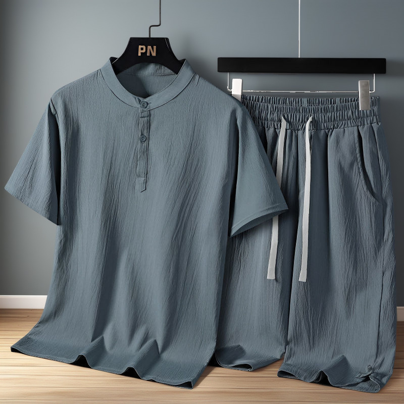 中国風の綿とリネンのアイスシルクカジュアルダッドスーツ薄い夏メンズ半袖クロップドパンツゆったりと通気性のある2点セット