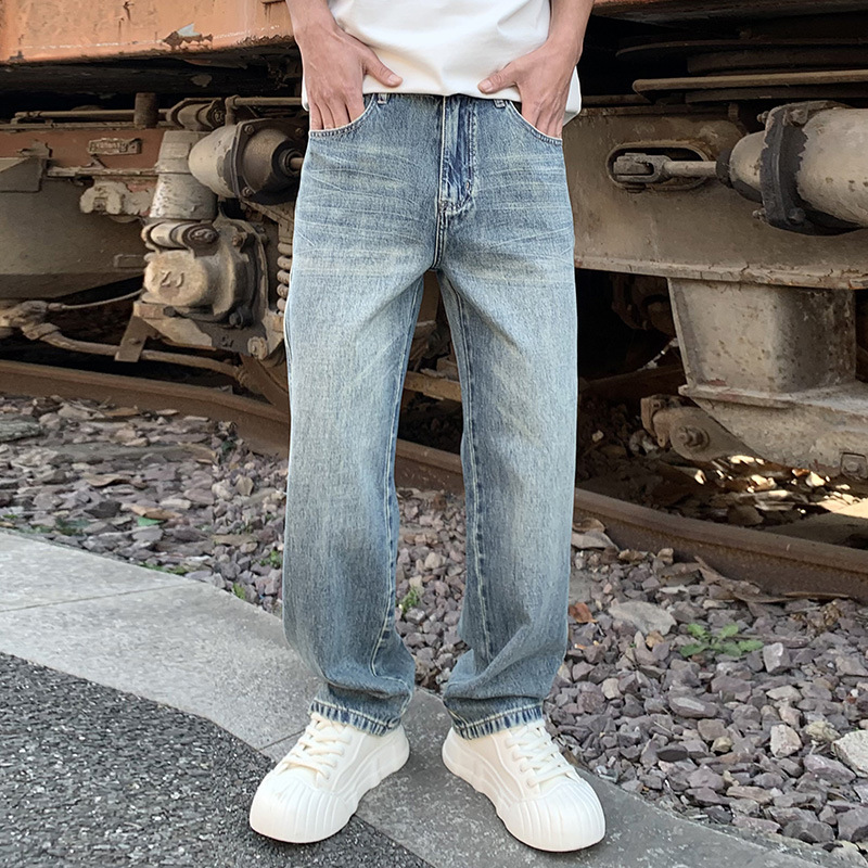 メンズジーンズアメリカンハイストリートウォッシュストレートパンツ80歳以上新作ボトムス春夏レトロブルー