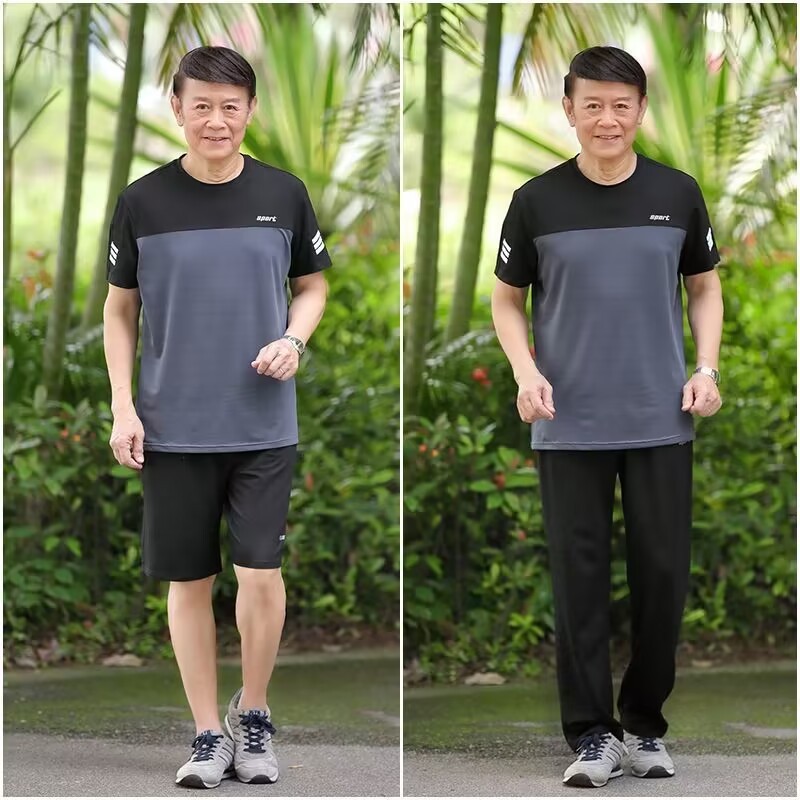 中高年お父さん向けの新しい夏用薄手半袖スポーツ・レジャースーツ、中年男性の夏用アウトドアスーツ