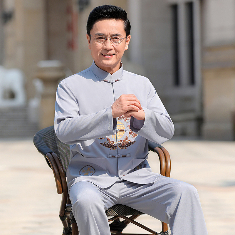 唐装メンズアイスシルク長袖スーツ春と夏中高年レトロスタイル漢服お父さん紳士服高齢者おじいちゃん太極拳スーツ