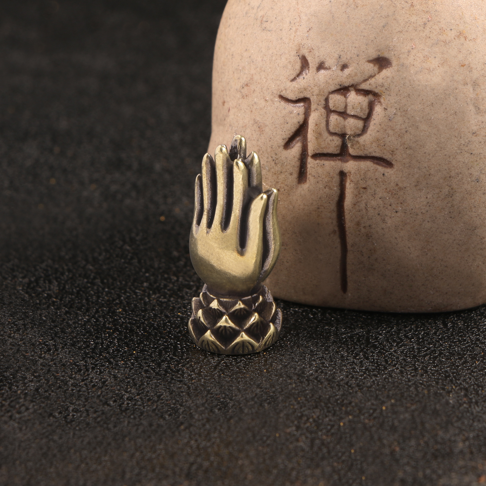 手作りの真鍮の復古は古い蓮の花座の禅意の仏珠の両手を合わせます。