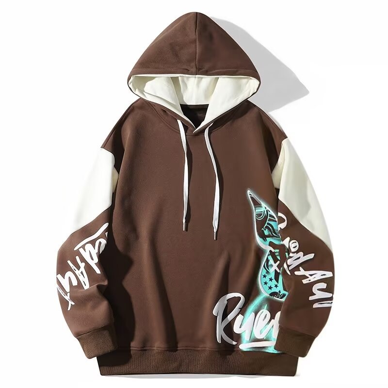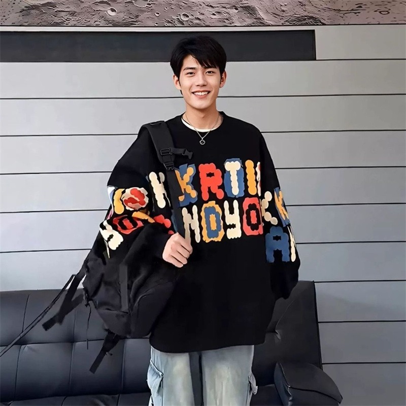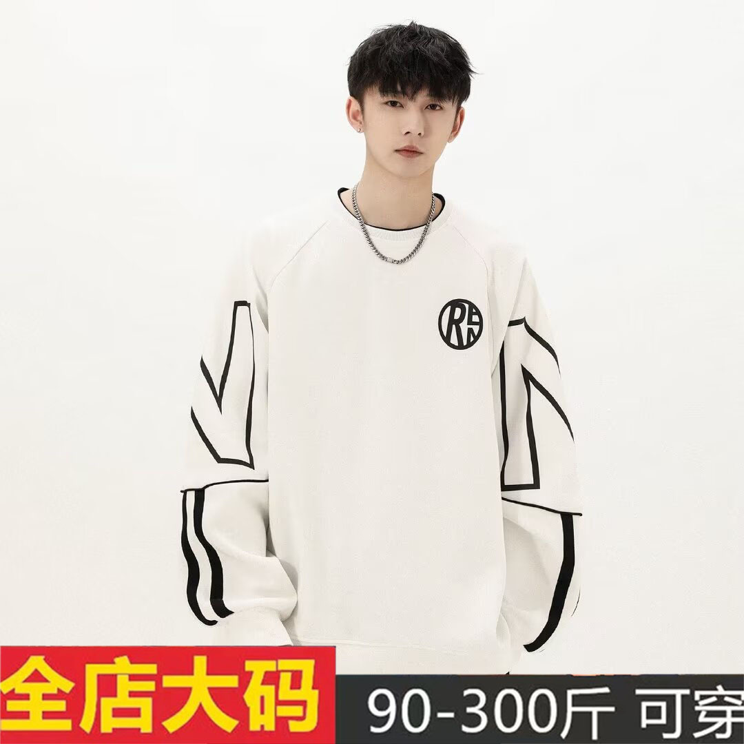 重いポンドの丸首の衛衣の男性の2024の新型の春秋のアメリカ式のゆったりしている大きいサイズの潮の札は長袖のtシャツのコートをつなぎ合わせます。