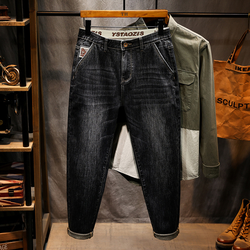 2025年の新型の小さい錐の小さいカーブの刀の純粋な黒色のジーパンの紳士服の小さい足のズボンの大きいサイズの太った人