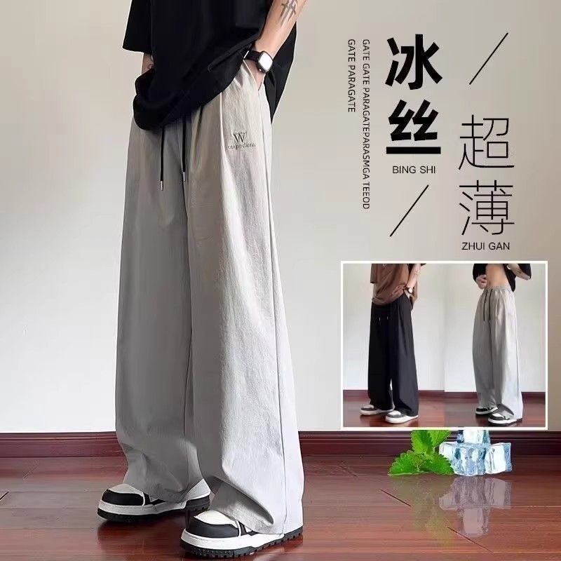 アイスシルクパンツメンズ夏薄いカジュアルドレープ通気性弾性速乾性ワイドレッグスポーツ超薄型ストレートパンツ