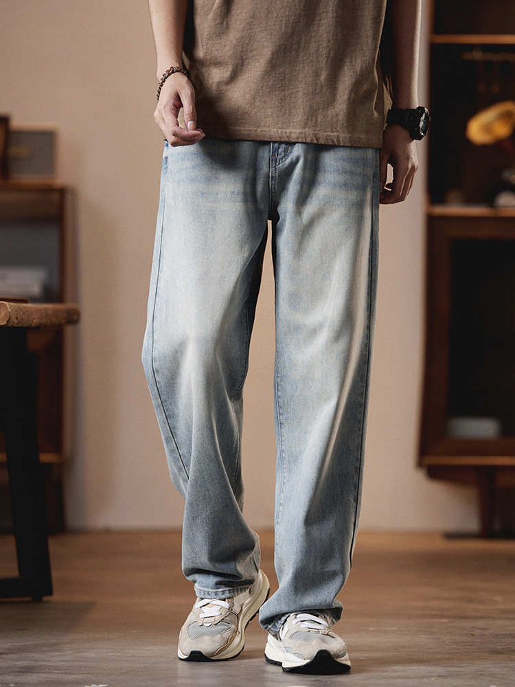 ジーンズ男の夏のゆるいストレート感のあるワイドパンツのゆるいカジュアルな薄い生地のズボンの水洗いデニム