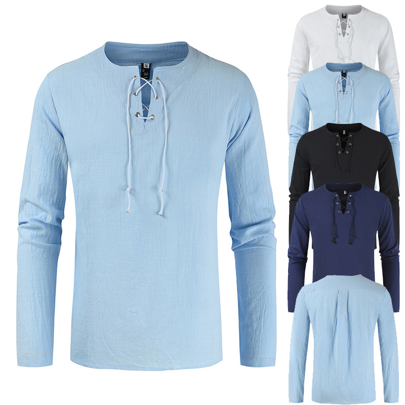 2022秋冬メンズ新作純色ストラップゆったり薄手vネックカジュアル長袖綿麻tシャツ