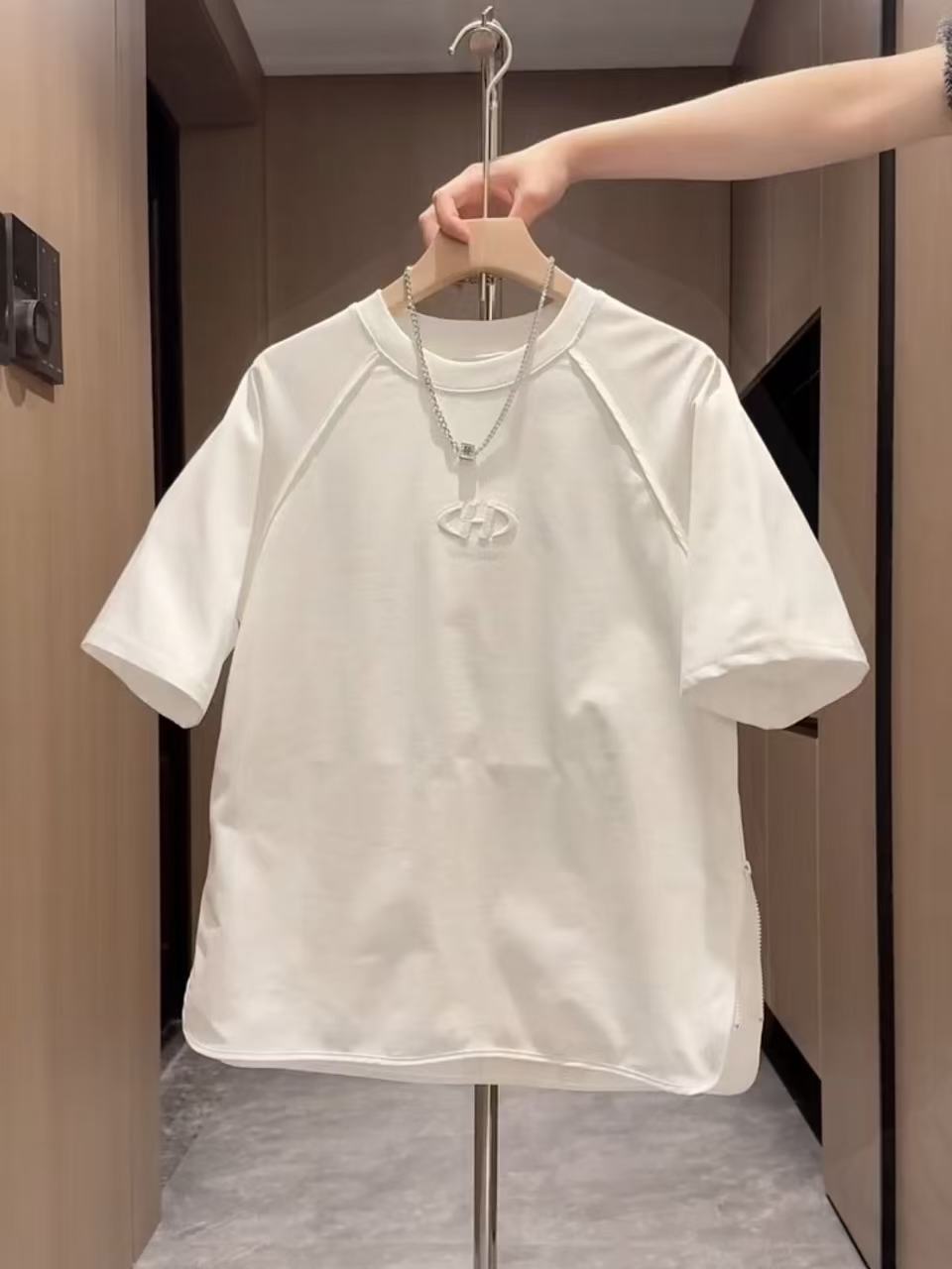 夏ジッパー刺繍ラウンドネック半袖 Tシャツメンズトレンディな多用途ソリッドカラートップカップルカジュアルインルーズ半袖