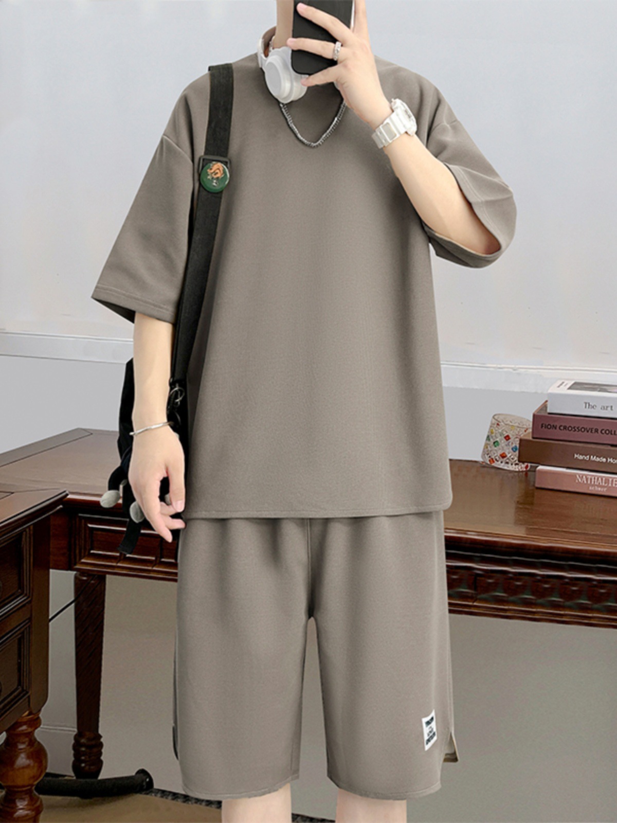 男性用の無地スーツ、夏用のアイスシルク半袖Tシャツ、ハンサムなトレンドブランドのスポーツトップスを備えたメンズスーツ