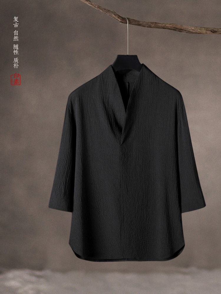 中国風メンズ夏レトロスタイルアイスシルク Tシャツ半袖メンズスーツトップ V ネック中国漢服七分袖