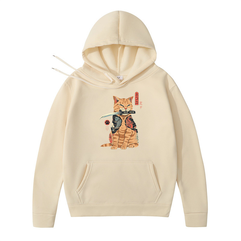 クロスボーダーヨーロッパとアメリカのストリートスタイル日本スタイルのサムライキャットプリント男性と女性のフード付きプルオーバースウェットシャツとベルベットスポーツジャケット