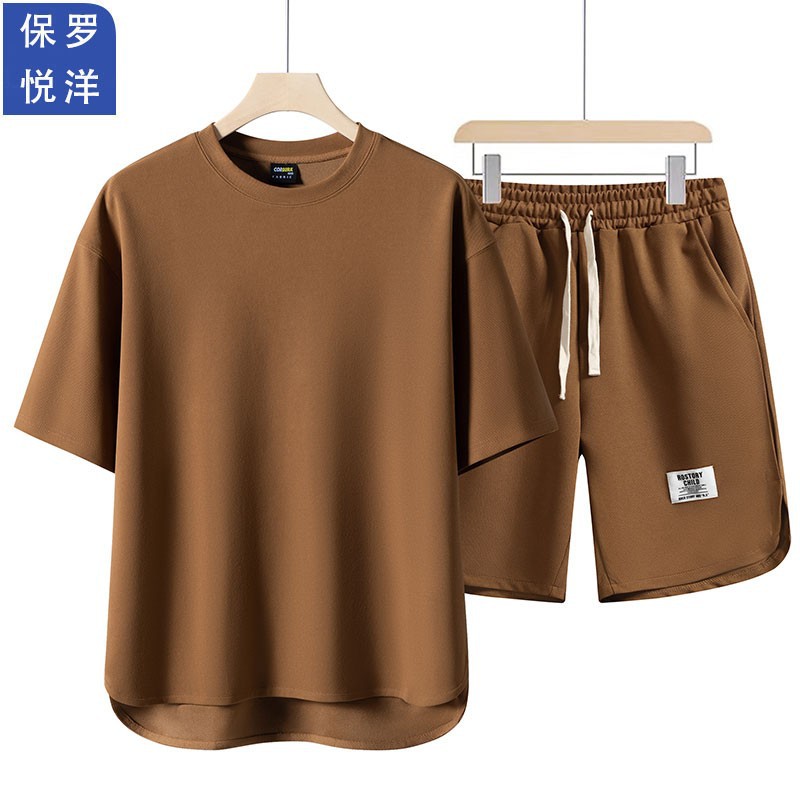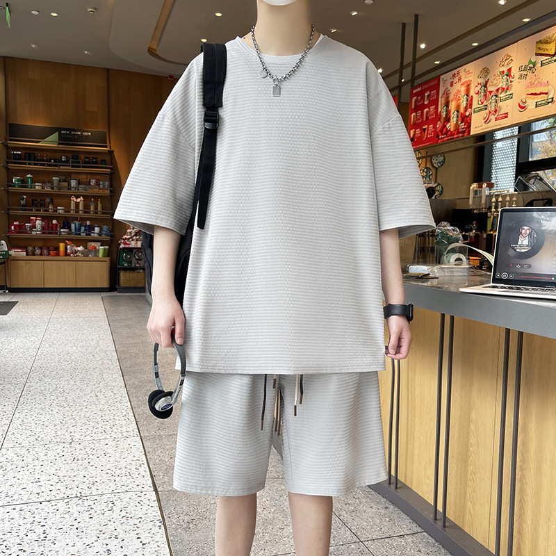 新しい夏のメンズトレンディなルーズ服トレンディなブランド学生半袖 Tシャツジャカードアイスシルクトップラウンドネックツーピースカジュアル