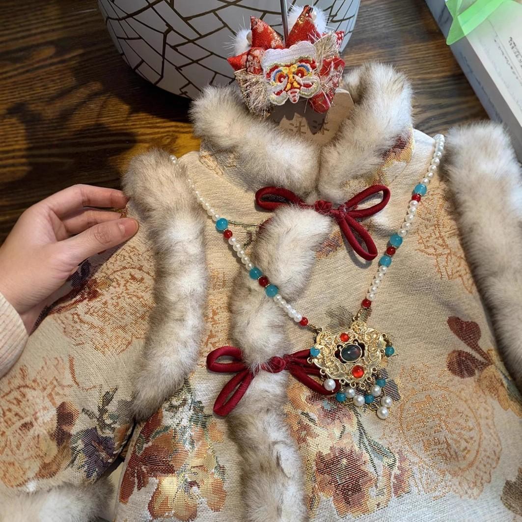 在庫あり~2025秋冬女児用ジャカード織り豪華旗袍ベストとスカートの新作お正月服セット(ツーピース)