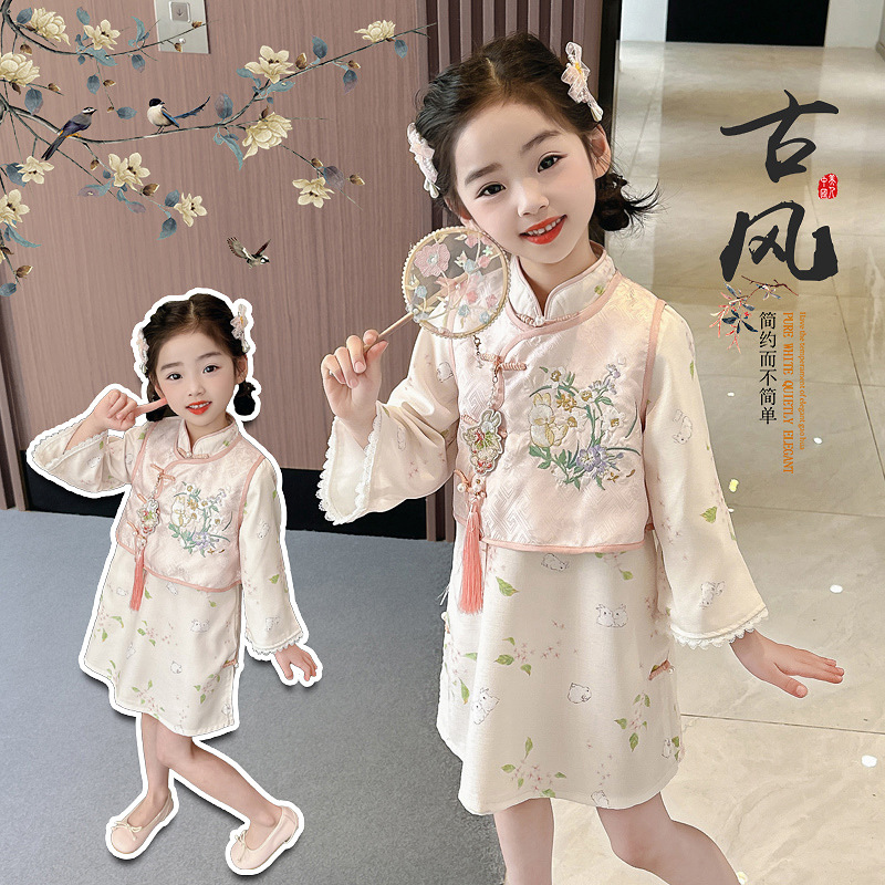 女の子の花のチャイナドレスの漢服の唐服の子供の女の子の中国風の春の新型の洋風の甘い古風のスーツ