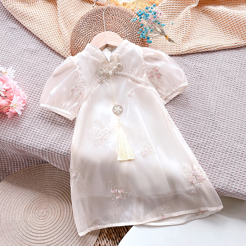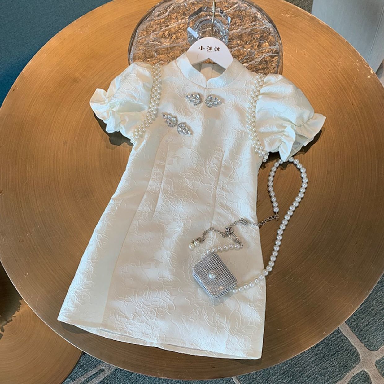 少女中国風チャイナドレス夏ドレス 2025 新しいスタイル子供のパフスリーブ夏の気質ドレス