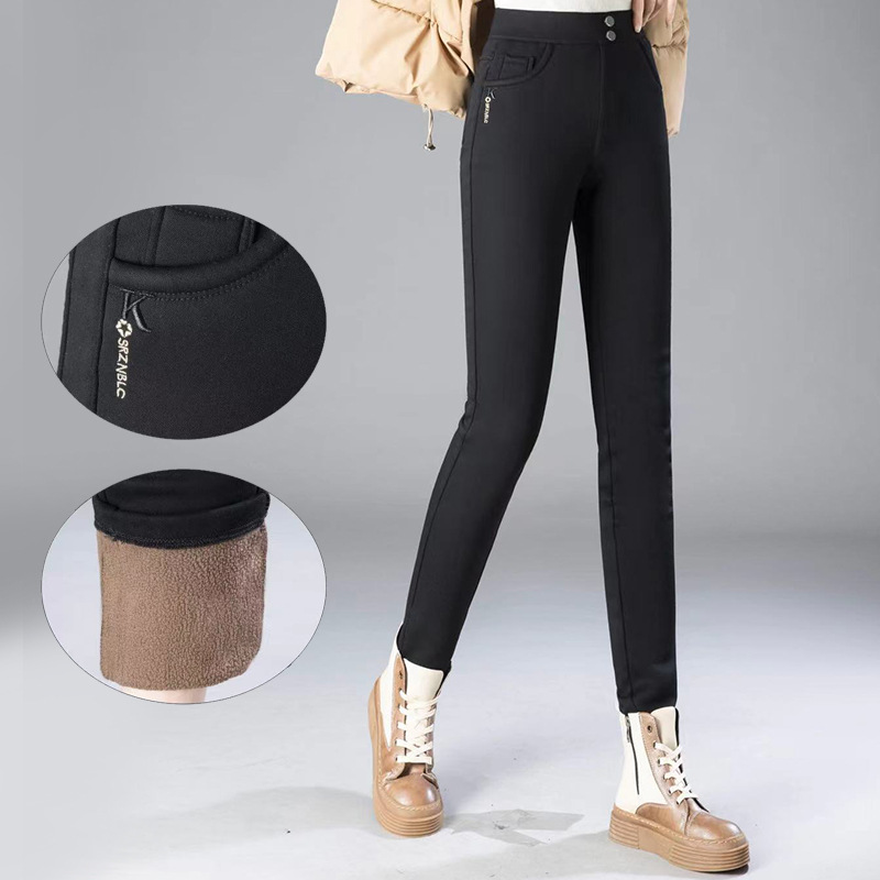 2024冬の新しいポニー刺繍とベルベットの女性のズボンの鉛筆のズボンは痩せていて、ベルベットのズボンを厚くしている