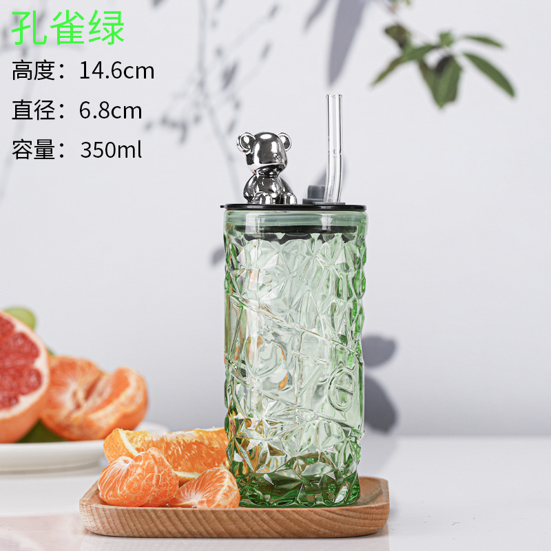 クリエイティブベアストローカップ蓋付きダイヤモンドガラスカップ家庭用ジュースドリンクウォーターカップ卸売ミニポータブル