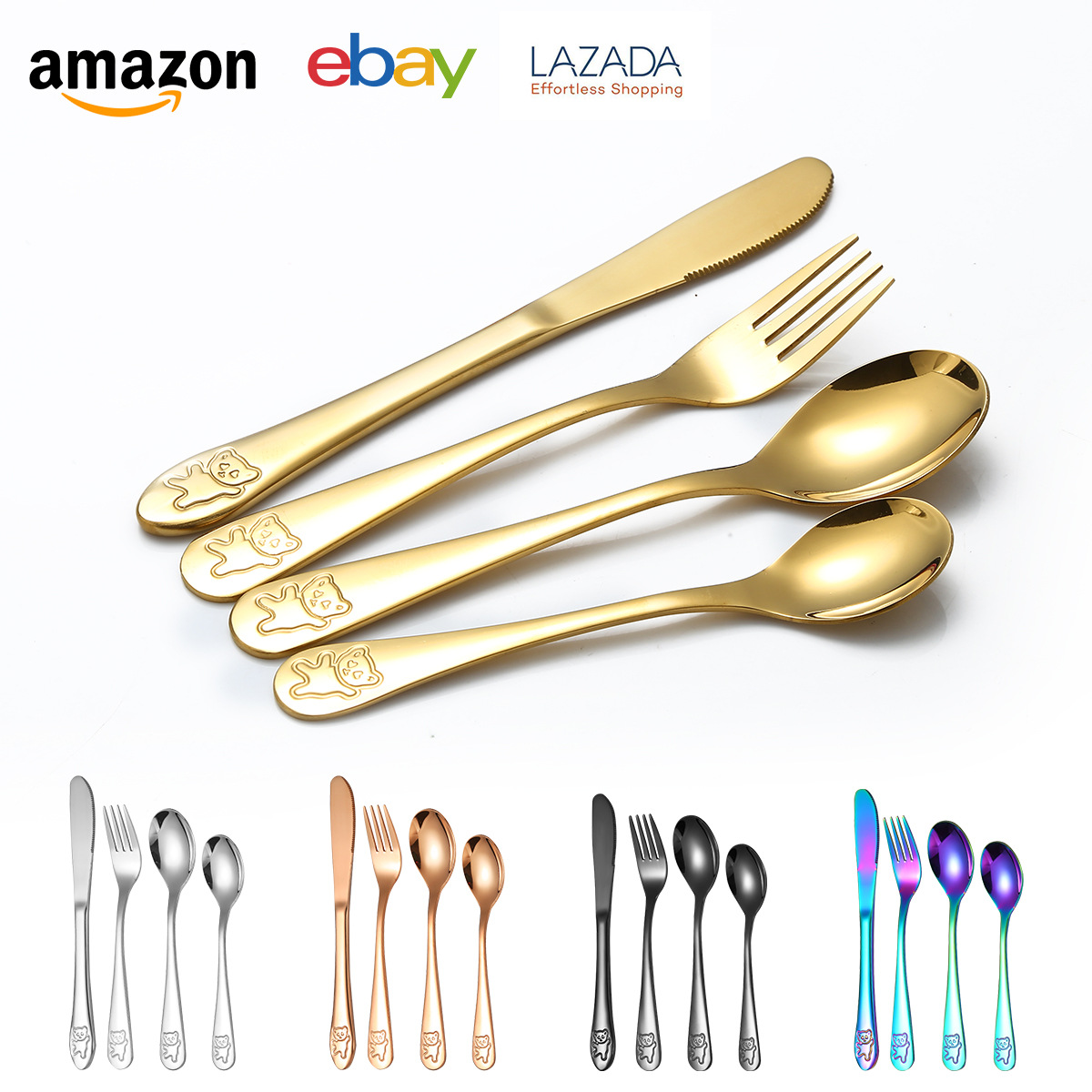 国境を越えて人気のあるステンレス熊食器ナイフフォークスプーンセットかわいい赤ちゃんスプーンフォーク子供ステーキナイフフォーク4pcs