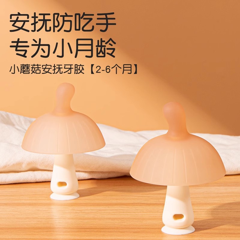 歯のゴムの赤ちゃんの小さい月齢は手のキノコの口を食べないでください。