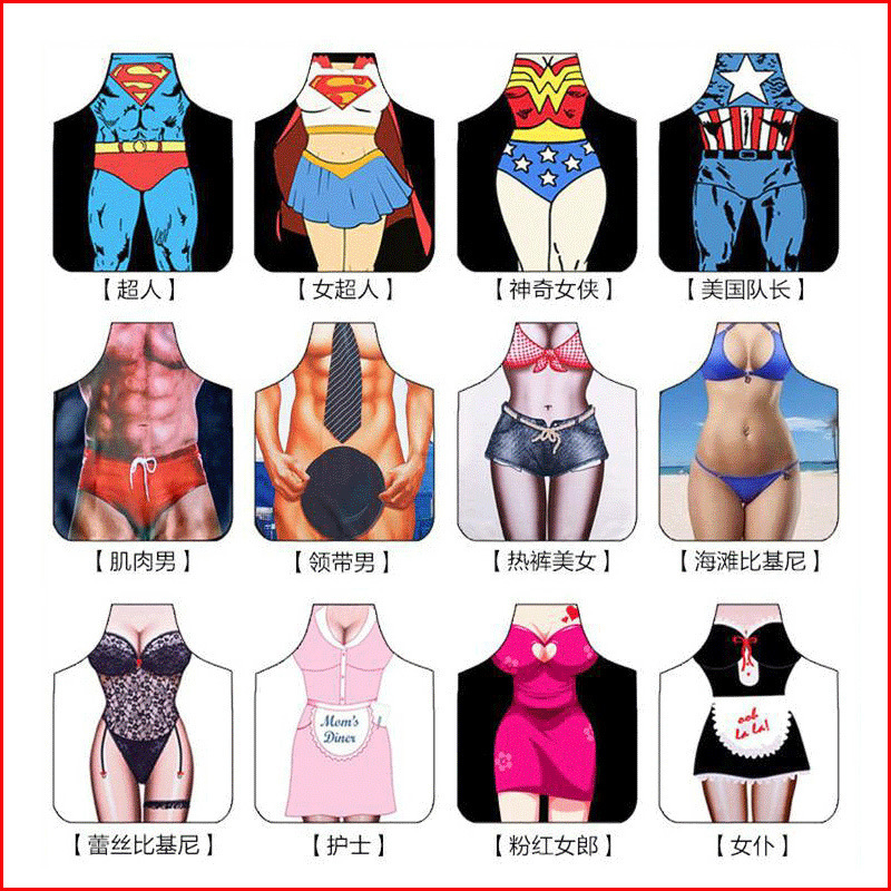 面白くて個性的なクリエイティブなエプロン、筋肉質の男性のビキニシリーズ、漫画のカップル、工場卸売、韓国風ホームウェア