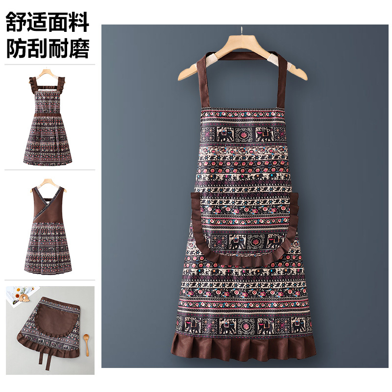 レトロエスニックスタイルエプロンキッチンと家庭用2025新作耐油純綿通気性のあるかわいい夏用薄手モデル女性用調理用