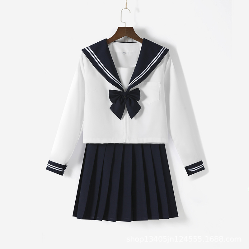 メーカーは日系jk制服紺襟本白二本のセーラー服春秋長袖のスカートセットを提供しています。