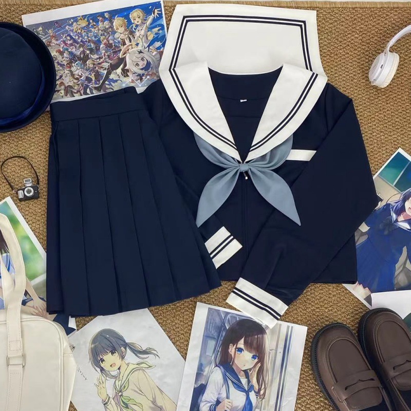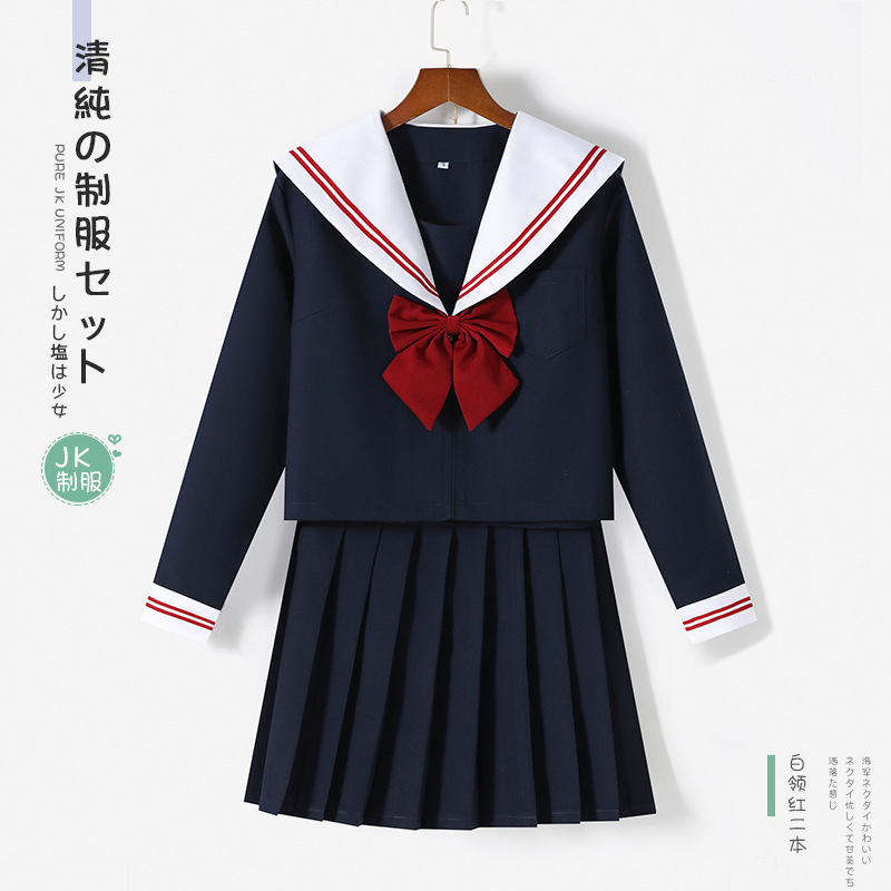 新型日系紺襟白二本jkセーラー服正統セット長袖学院風百パートナースカートメーカー供給