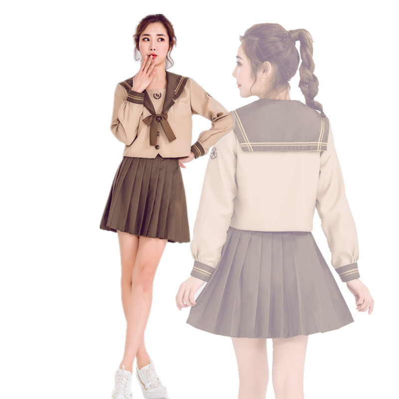 卸売 日本正統派 ソフトガール JK制服スカート ミルクティーブラウン 関東風変形襟 二本水手服 学生服セット