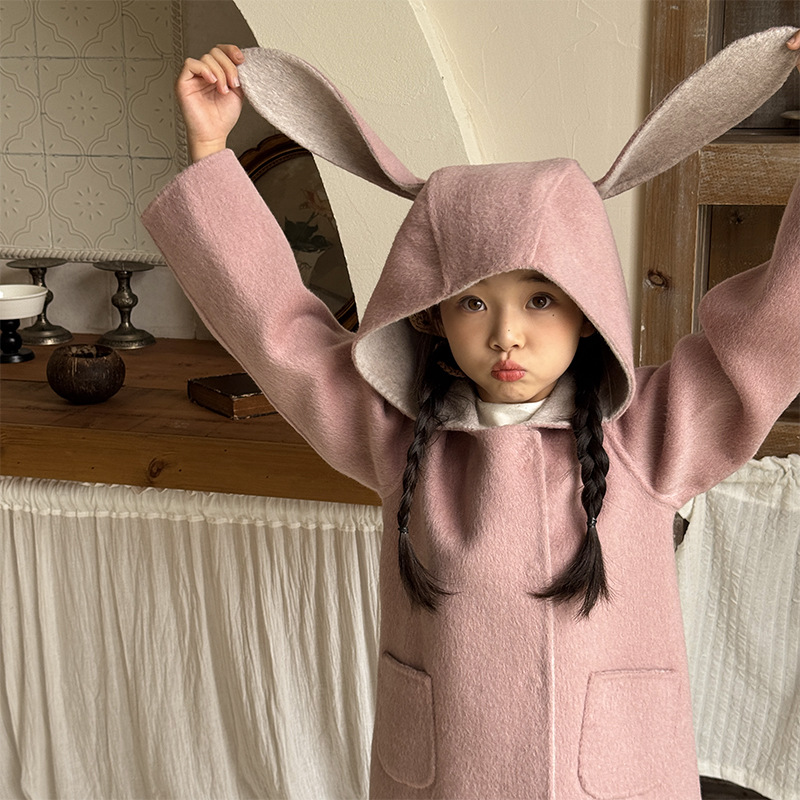 2025年子供用両面ウールコート ピンク色の子供服コート ウサギ耳付き漫画風ショート丈テール付きウールコート