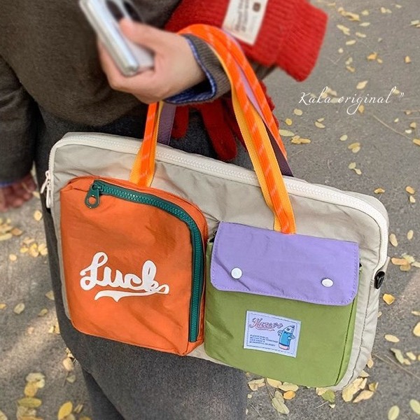 韓国風のコントラストカラーラップトップバッグ、ファッショナブルなスプライシング大容量クロスボディバッグ、カジュアル通勤キャンバスショルダータブレットバッグ