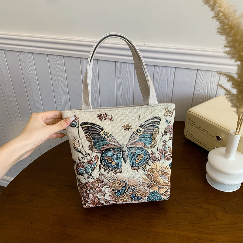 新しいファッショナブルで多用途なカジュアルな気質の女性のキャンバス両面ゴールデンシルクジャカード刺繍蝶ハンドバッグママバッグ