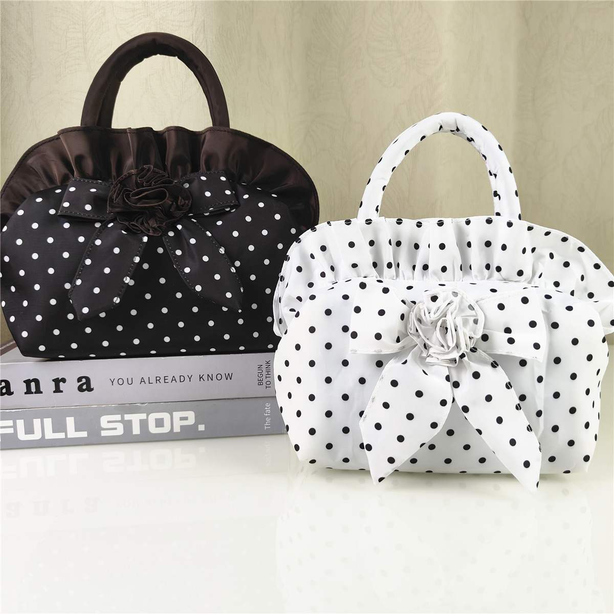 2025 新韓国スタイルかわいいスタイル黒と白の水玉模様の生地のリボン小さなバッグカジュアル多用途携帯電話小銭入れ