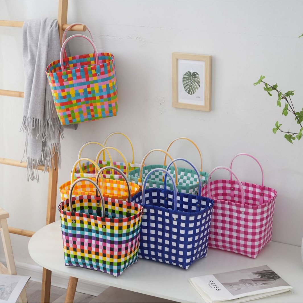 手作りの編み物のハンドバッグの女性の旅行のプラスチックバッグのお土産のプラスチックバッグの小さい方の手作りのビーチバッグ