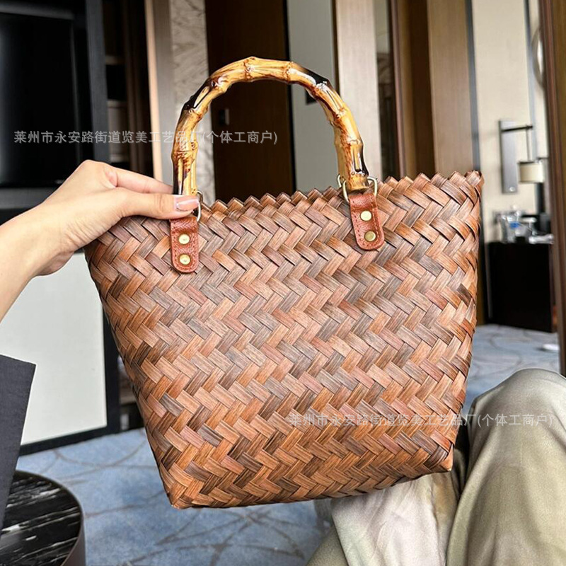 2025 新しい大容量手織りバッグ、ファッショナブルで多用途な織りバッグ、野菜かご、レトロな竹バッグ、ビーチバッグ