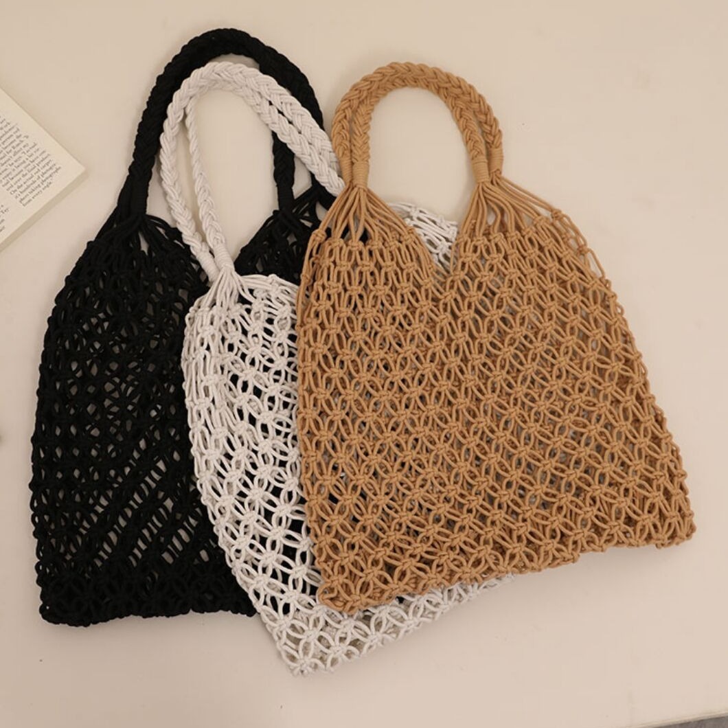 新商品の編み野菜かごの梱包には、編み包み防水ビーチバッグのハンドバッグがついています。