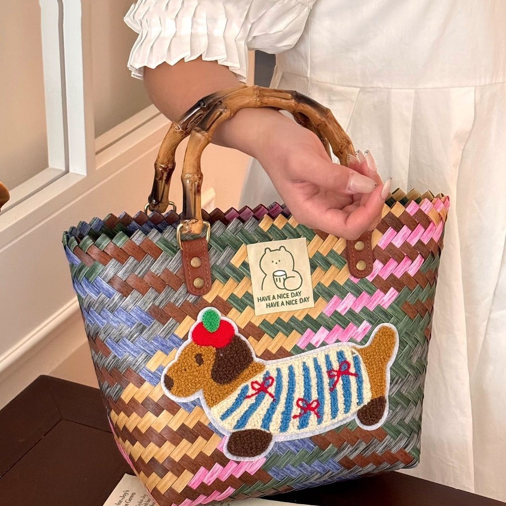 かわいいダックスフント柄の編み込み野菜かごバッグ2025ハンドバッグ通勤トートバッグ旅行休暇2025新作