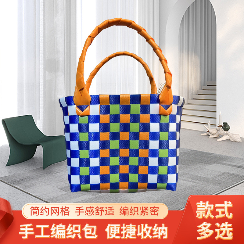 手編みプラスチック製野菜かごバッグ、カラフルな格子柄、満月のお土産、小さなかご、ビーチバッグ、手持ち