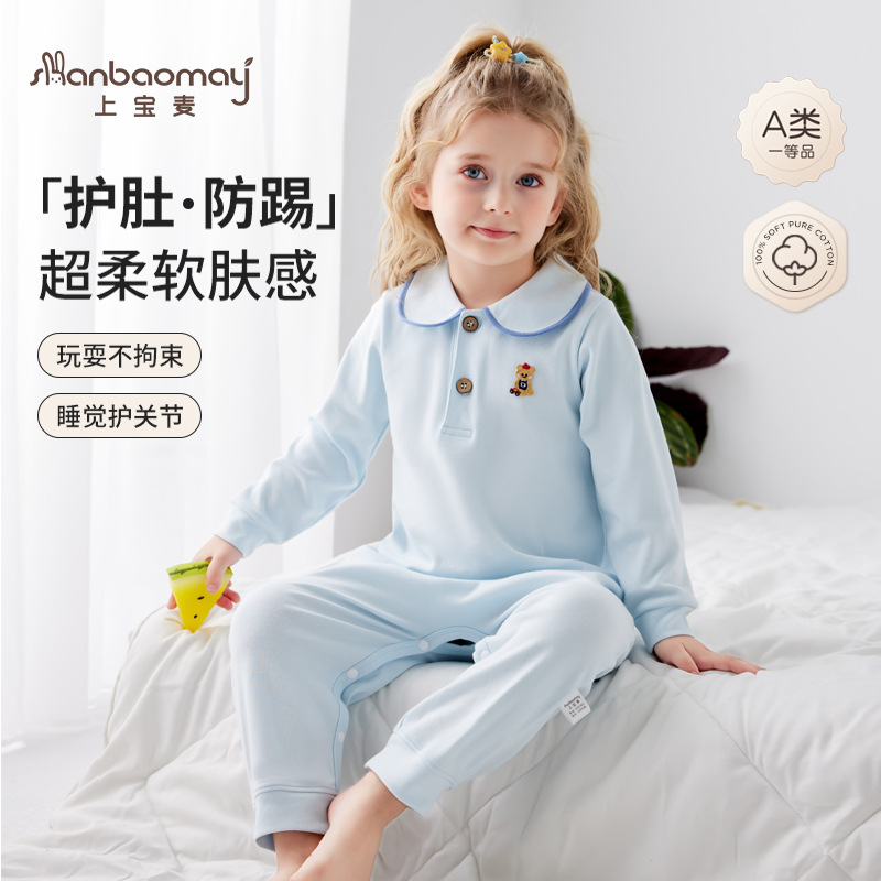 上宝麦春夏子供連体パジャマ綿綿柔らかい男女赤ちゃん家庭服セット腹保護蹴り防止布団