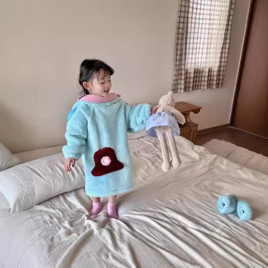 フランネルの女の子のプリントパジャマの家の服の中の大きい子供の両面の毛の帽子のバスローブの春の男の子はポケットを持って寝ます。