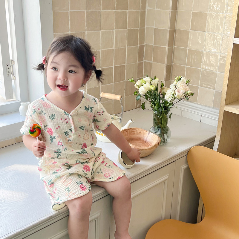 上宝麦春夏児童連体パジャマ綿柔らかい男女の赤ちゃんの家の服は腹を保護します。