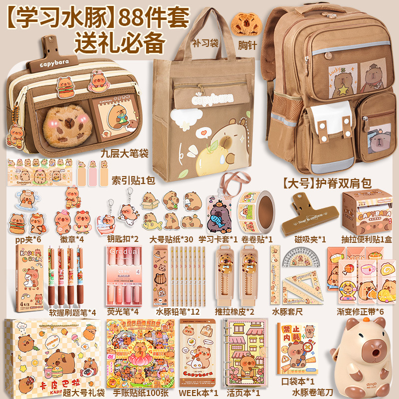 カピバラ スクールバッグ 文具セット 男の子 女の子 バックパック 背骨保護 小学生 新学期ギフトパック