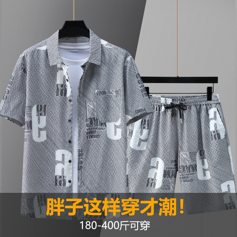 氷糸セット男性夏の薄手ジャカードと太ったカジュアルシャツのパンツがゆるい2セット2402セット