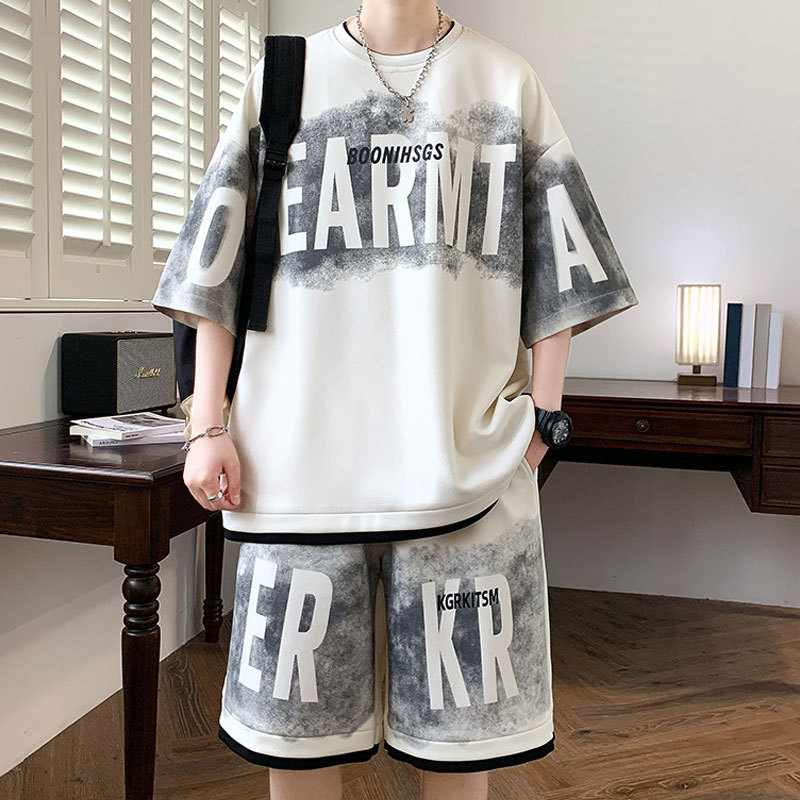 メンズ大きいサイズスポーツスーツ夏アイスシルク新しいトレンディなブランド偽ツーピース半袖ショーツティーンエイジャーカジュアルツーピース