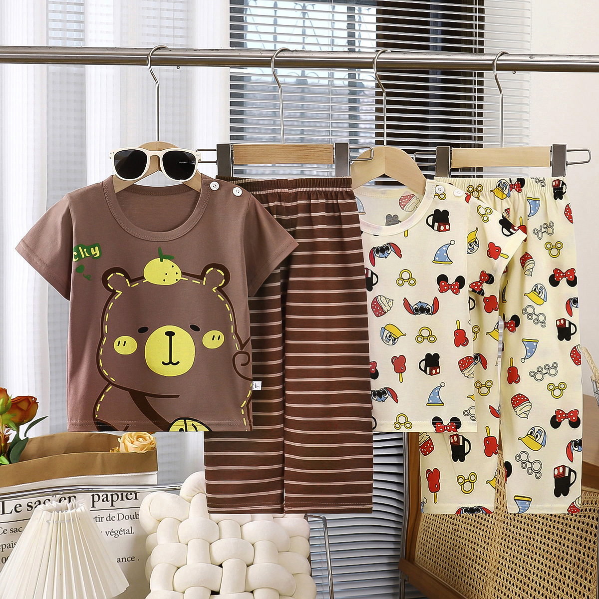 子供用ホームウェア 純綿 エアコン服 男の子 女の子 パジャマセット A級 夏 半袖 九分丈パンツ 丸首