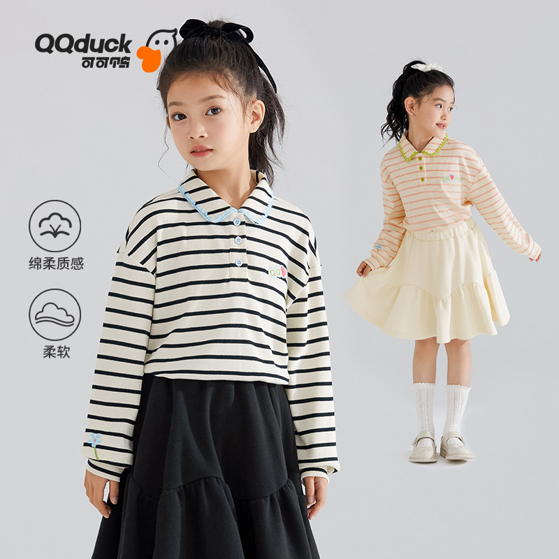 QQduckカカオアヒル子供tシャツ女の子長袖poloシャツ中大子供服折り襟トップス秋新作ファッション